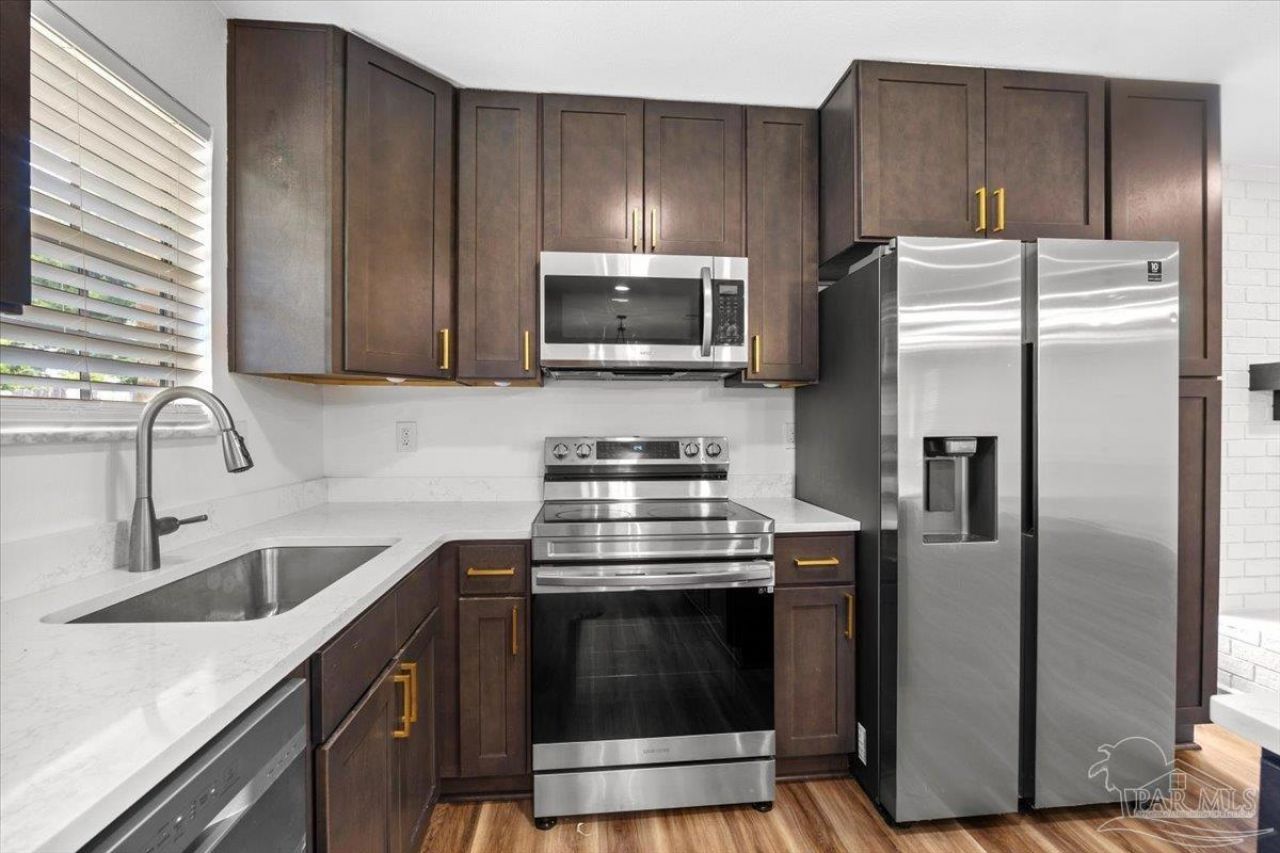 5897 Somerset Drive sits in the quiet Crescent Lake community with unmatched access to everything Pensacola has to offer, Baptist Hospital, NAS Pensacola, Pensacola State College, easy I-10 access, and a short drive to Historic Downtown and the Beach. Inside, the layout is open and functional. Natural light fills the living space, which flows seamlessly into the dining area and into a kitchen that goes well beyond a standard kitchen. Beautiful quartz countertops, stainless steel appliances, and a thoughtful cabinet layout give this kitchen real substance, the kind of space that works whether you're cooking for two or hosting a crowd. The finishes are clean, consistent, and clearly not an afterthought. New flooring and updated lighting carry throughout the home. Three bedrooms offer real space, including a primary suite with a walk-in closet and private en-suite. Both bathrooms have been refreshed with modern vanities, updated fixtures, and tiled showers. Outside, the fully fenced yard is landscaped and private, perfect for weekend cookouts, a garden, or just room for the family to breathe. The big-ticket items are already handled: roof, HVAC, and water heater are all approximately 5 years old, and there's NO HOA. This one is genuinely turnkey.